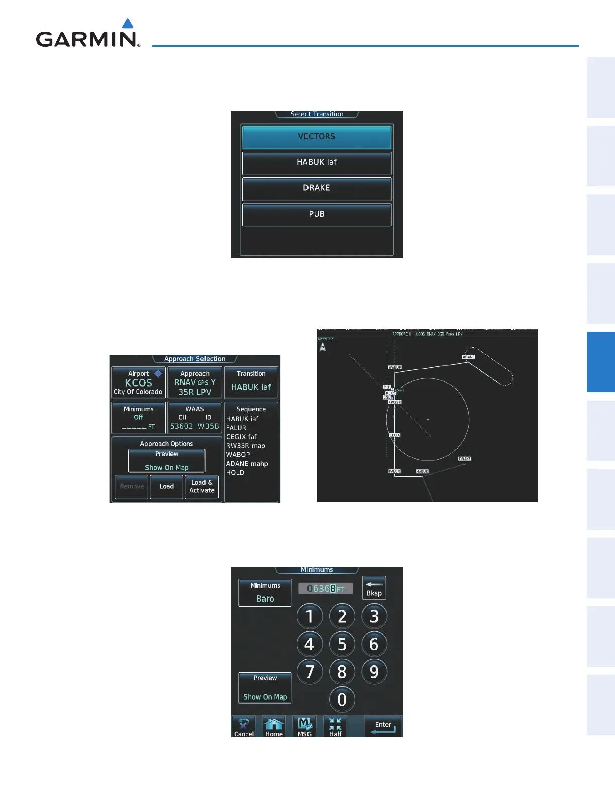 g) Touch the Minimums Button to select the minimum descent altitude (Figure 5-186). Touch the Baro Button