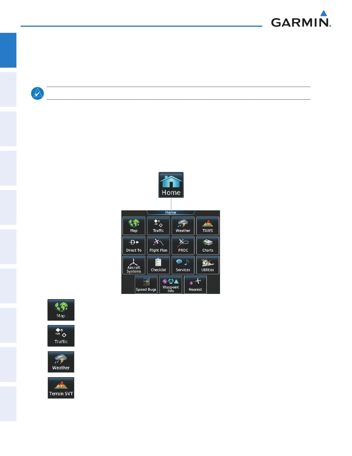 On the Home Screen, the top row of buttons (Map, Traffic, Weather, and Terrain SVT or TAWS) are