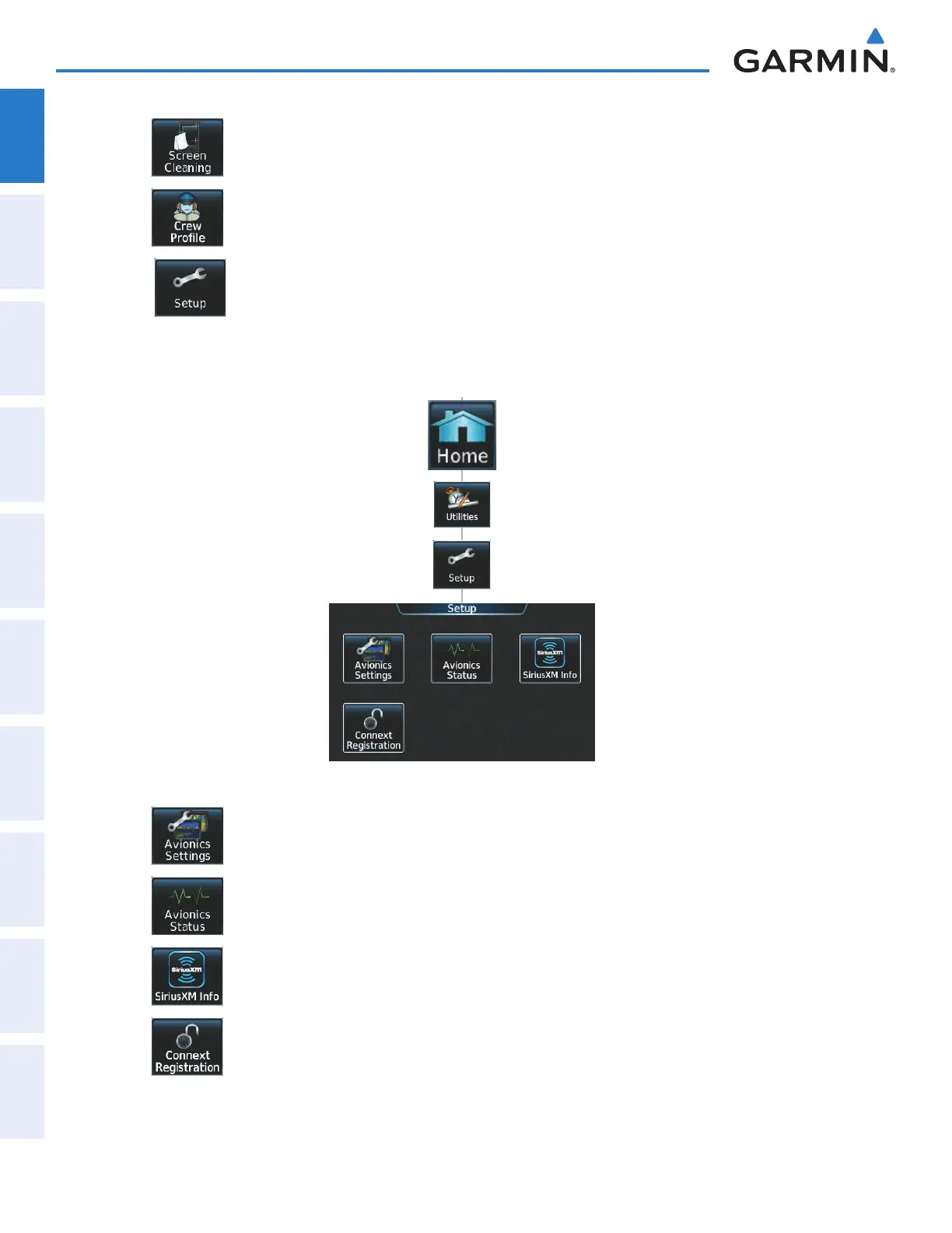 Avionics Settings, Avionics/Database Status, SiriusXM information, and Connext