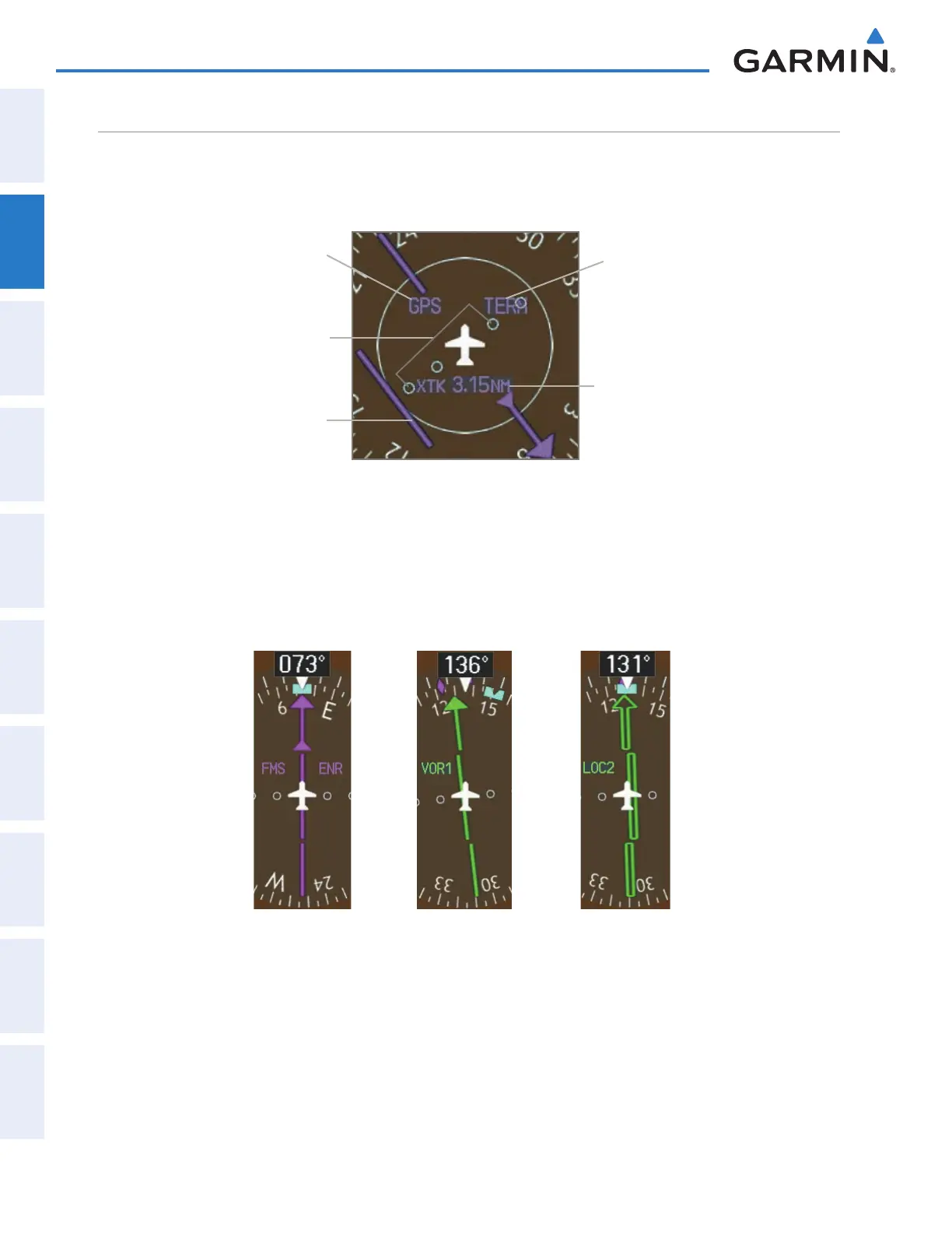 source, magenta for FMS and green for VOR and LOC. The full scale limits for the CDI are defined by a GPS-