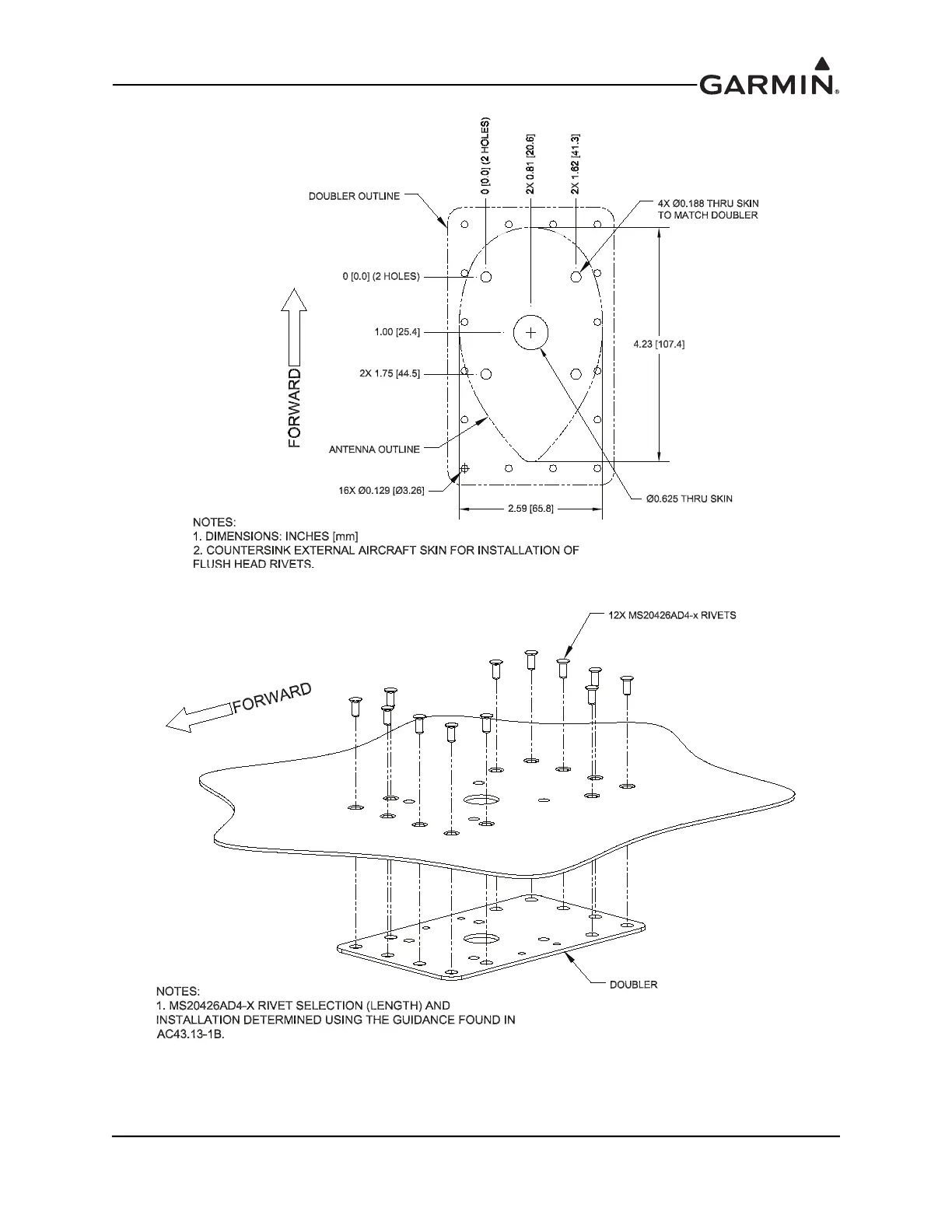 Figure 20-11 Doubler Installation, Teardrop Footprint Antenna, Skin Thickness 0.032" to 0.049"