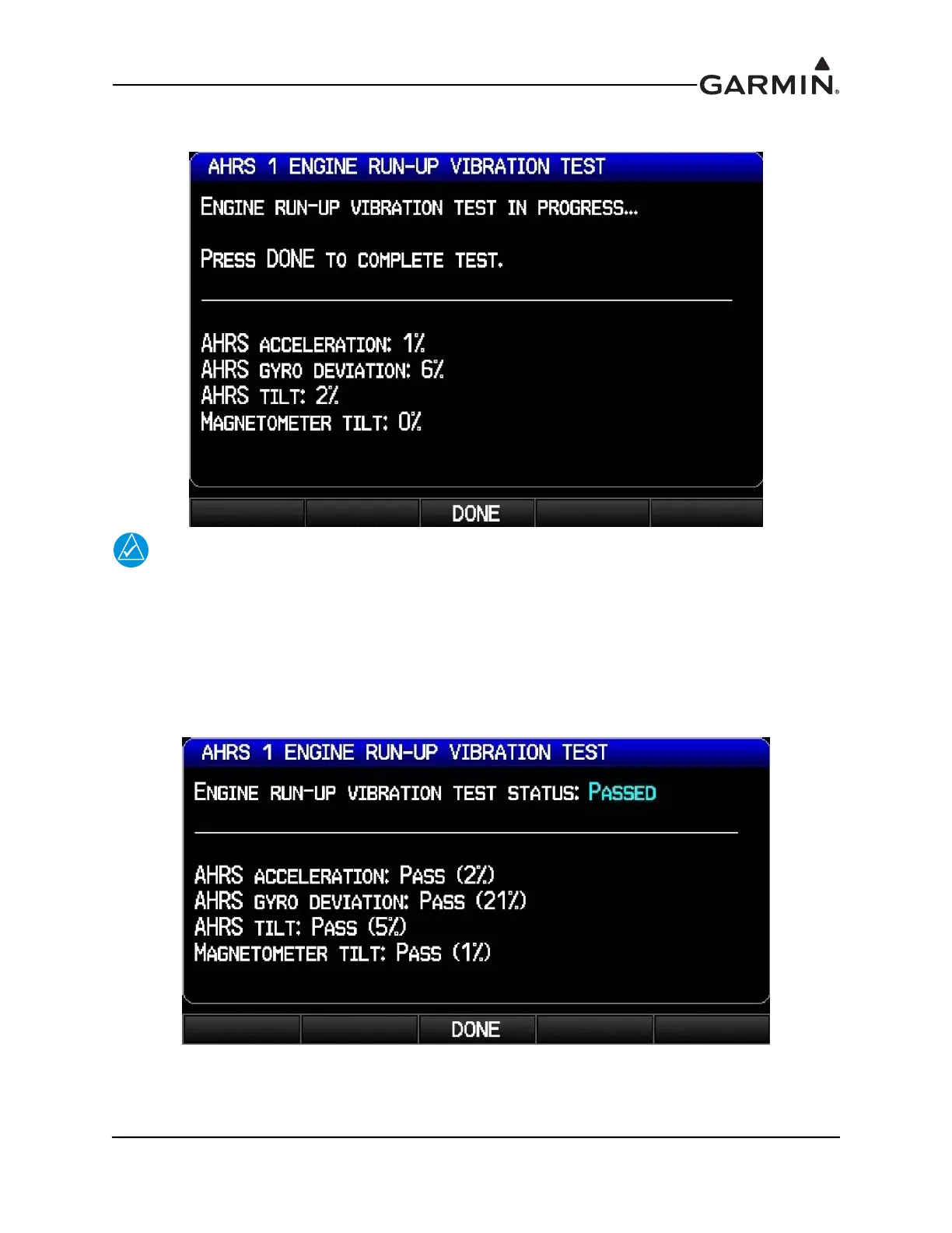 Make sure that test results indicate Passed, then press the Done softkey to return to the ADAHRS