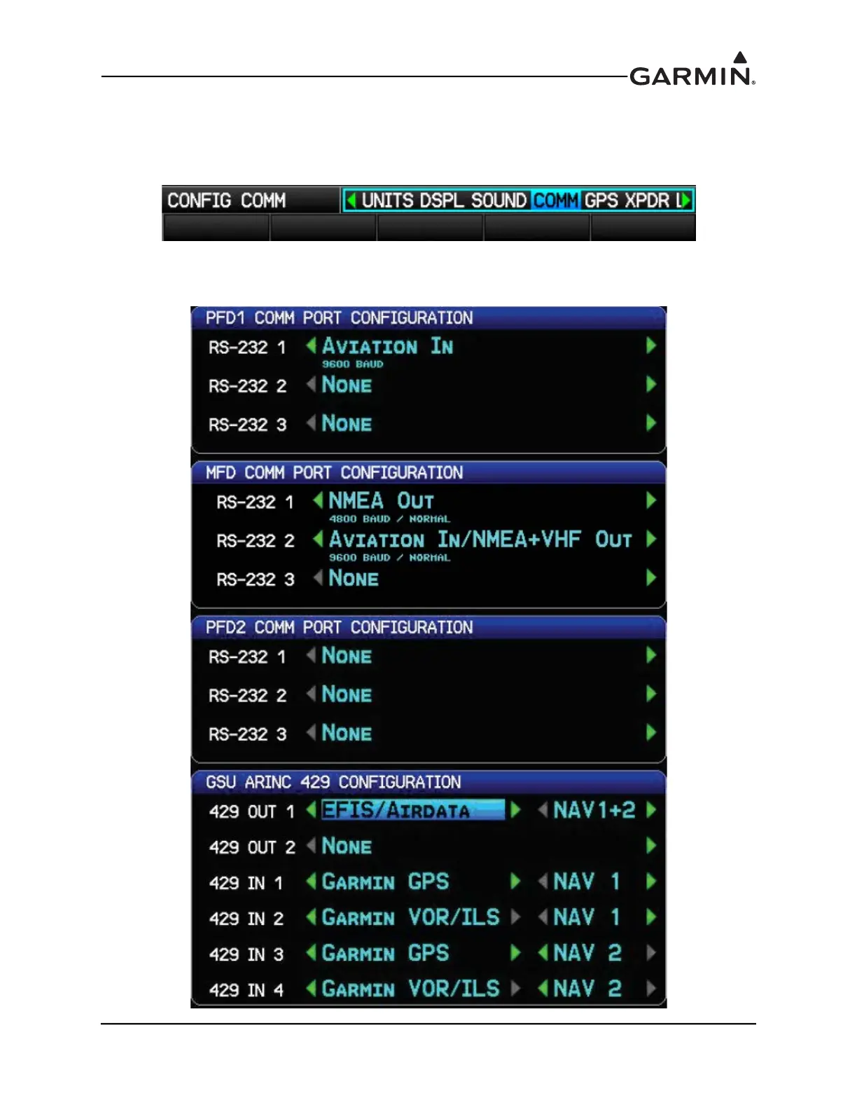 The COMM Configuration Page allows configuration of the RS-232 ports on the GDU 37X displays, and