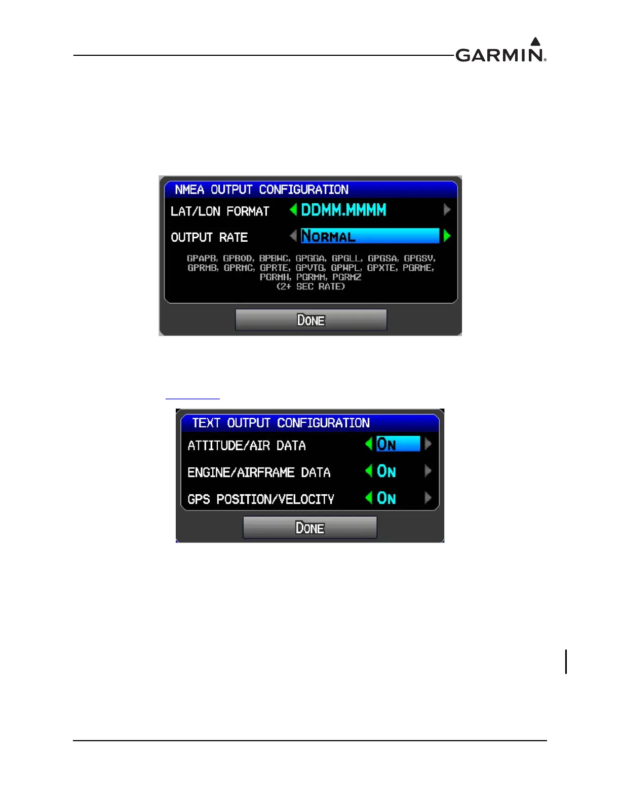 Engine/Airframe Data, and GPS Position/Velocity) to On or Off. The On setting allows the output of Text