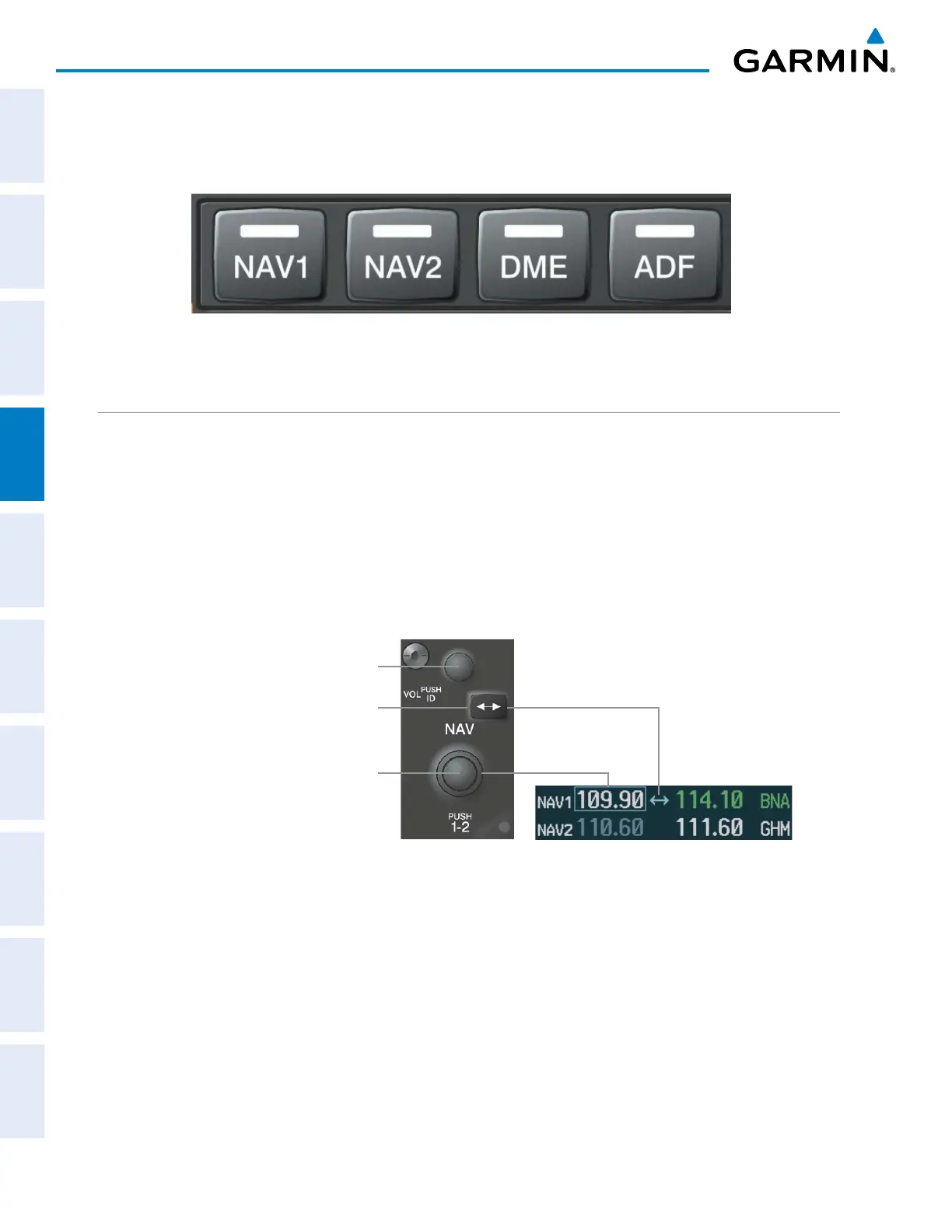 NAV1, NAV2, DME, or ADF Key selects and deselects the navigation radio source. Selected audio can be heard