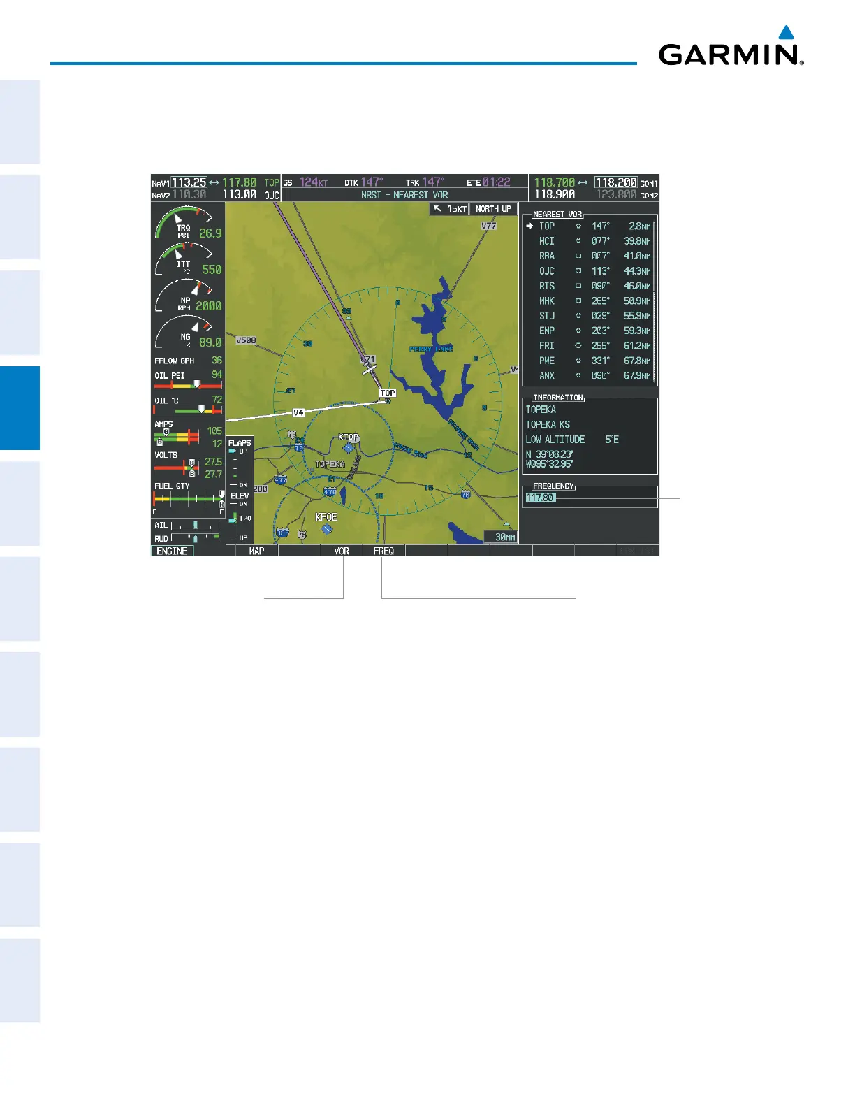 In the example shown, the VOR list is selected with the VOR Softkey or from the page menu. The FMS Knob