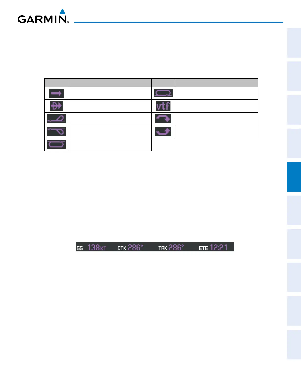 • Active flight plan leg (e.g., ‘D-> KICT’ or ‘KIXD -> KCOS’) or flight plan annunciations (e.g., ‘Turn right to