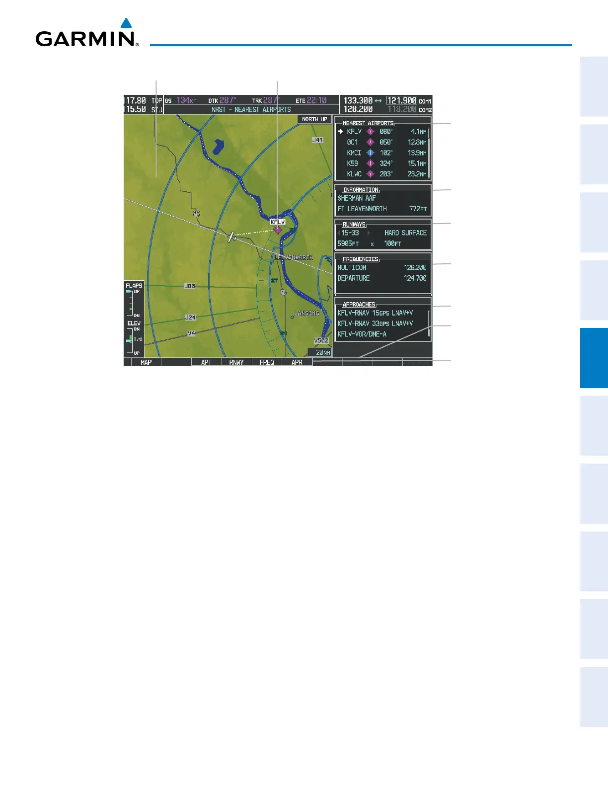 1) Press the NRST Softkey to display the Nearest Airports Window. Press the FMS Knob to activate the cursor.