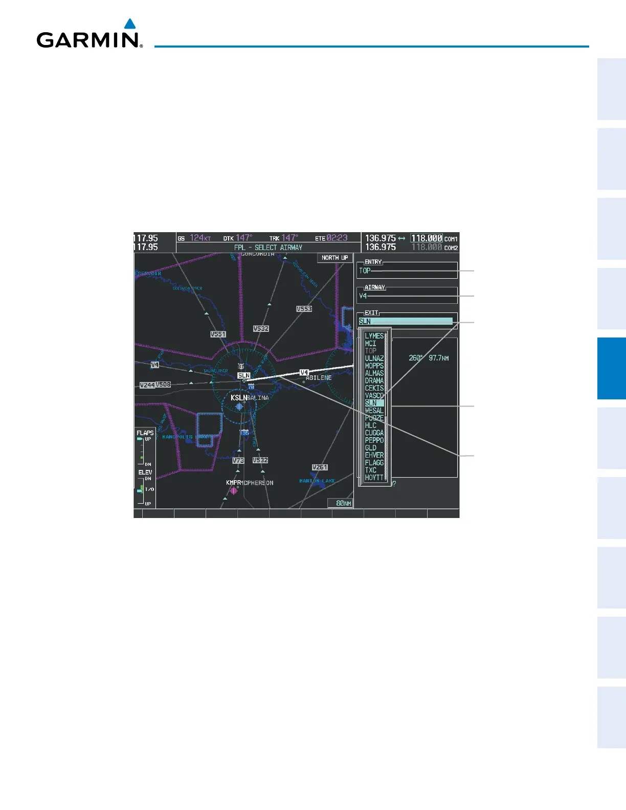 5) Turn the FMS Knob to select the desired airway from the list, and press the ENT Key. Low altitude airways are