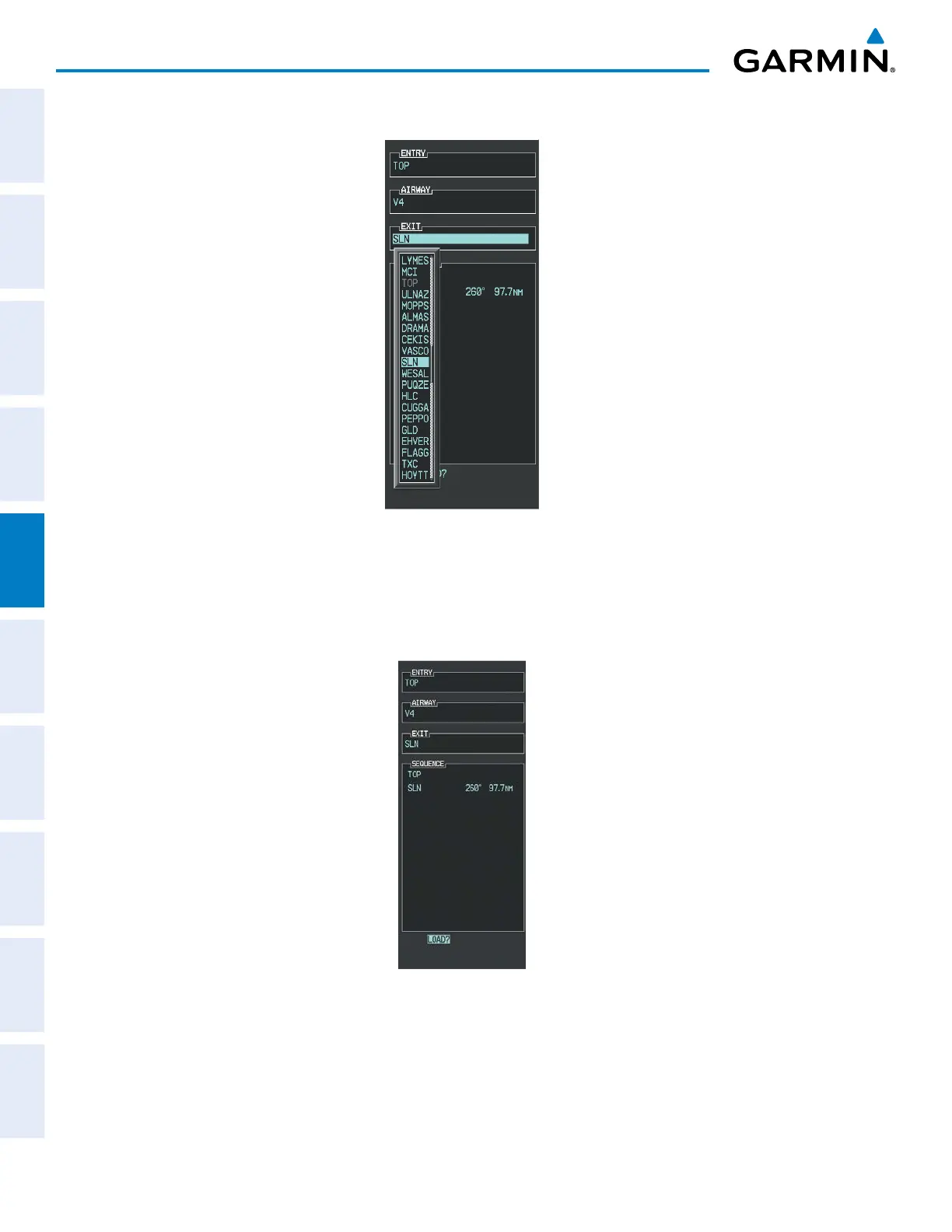 j) Press the ENT Key. The selected airway and exit are displayed, and the prompt “LOAD?” highlighted as in