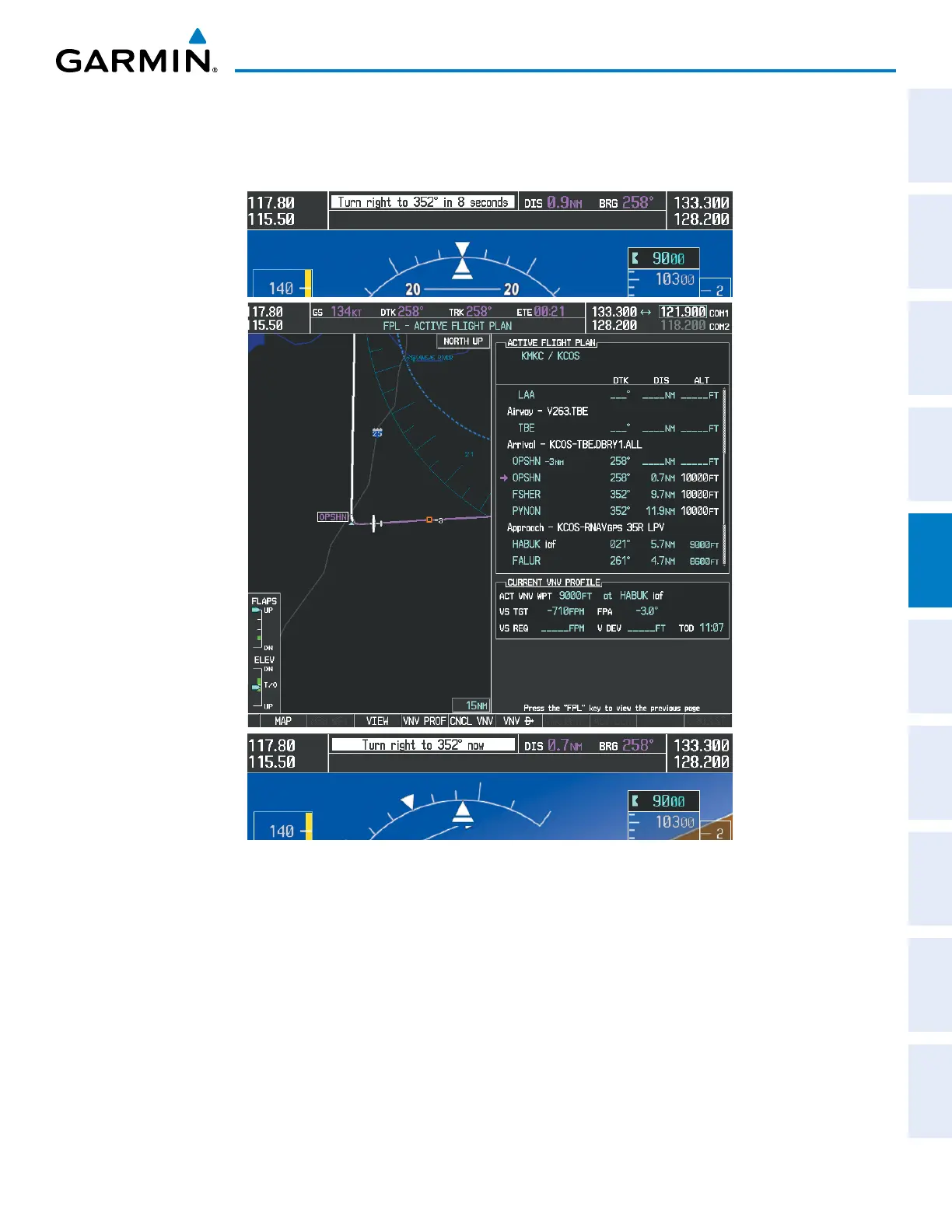 18) The aircraft is approaching OPSHN. The upcoming turn and next heading are annunciated at the top left of the