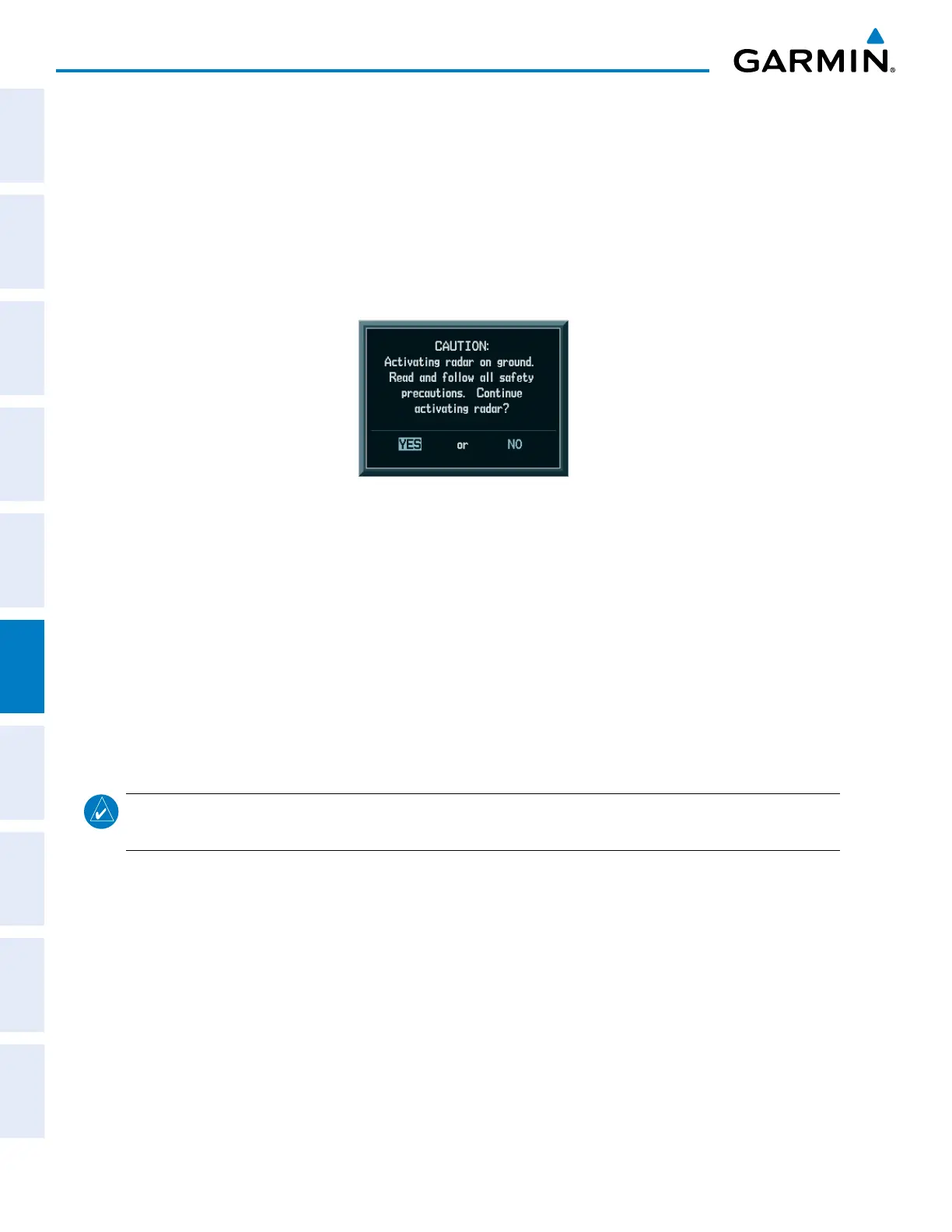 b) Turn the small FMS Knob to highlight YES and press the ENT Key to continue radar activation.