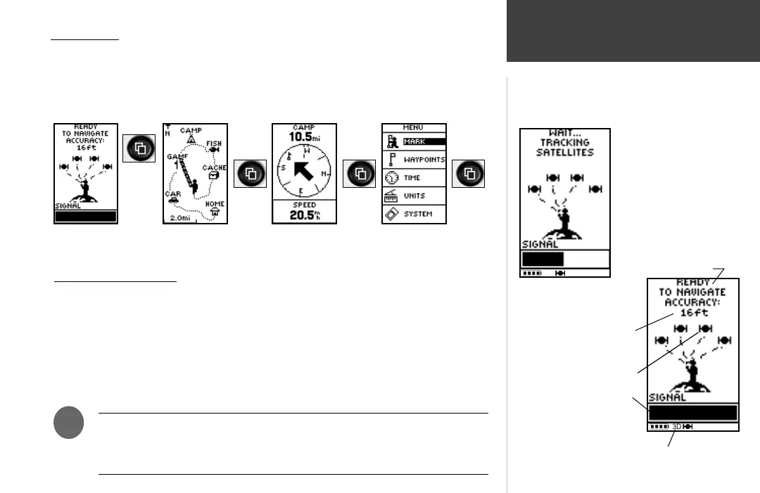 display screens). These pages are the Satellite, Map, Navigation, and Menu.