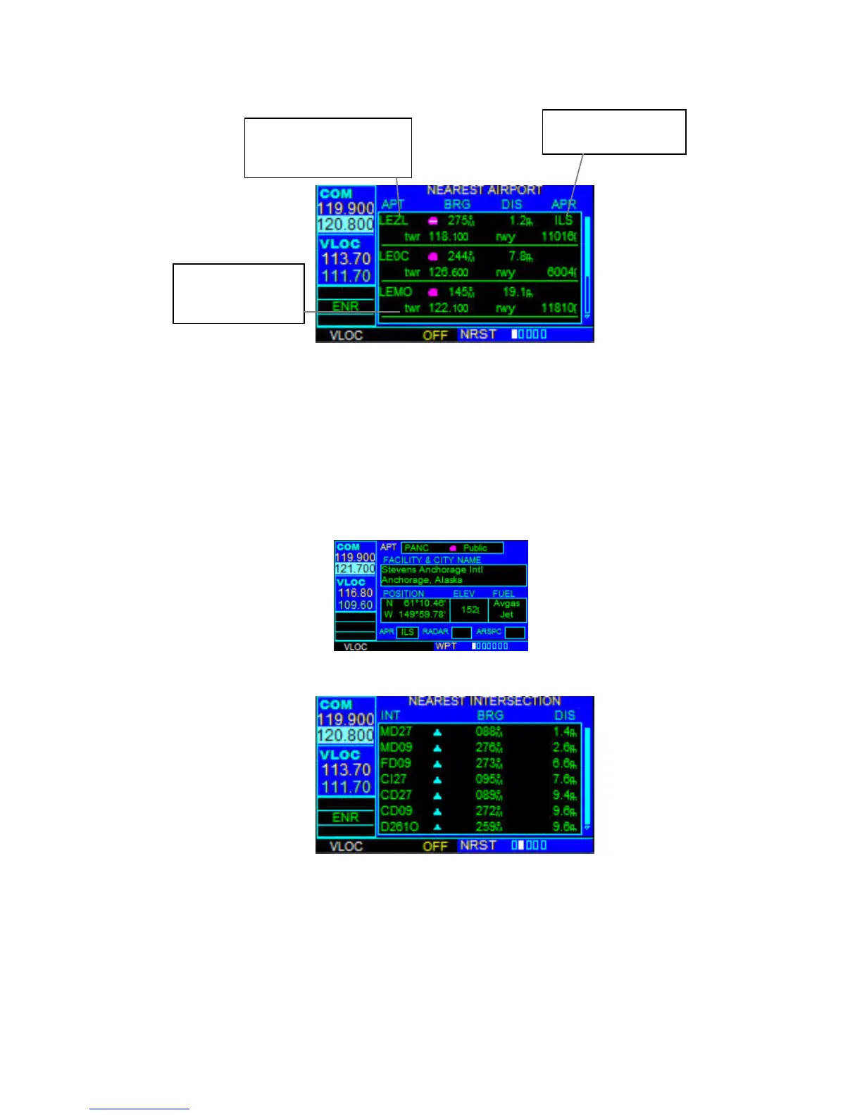 The Nearest Airport Page displays the identifier, symbol, bearing, and distance to the