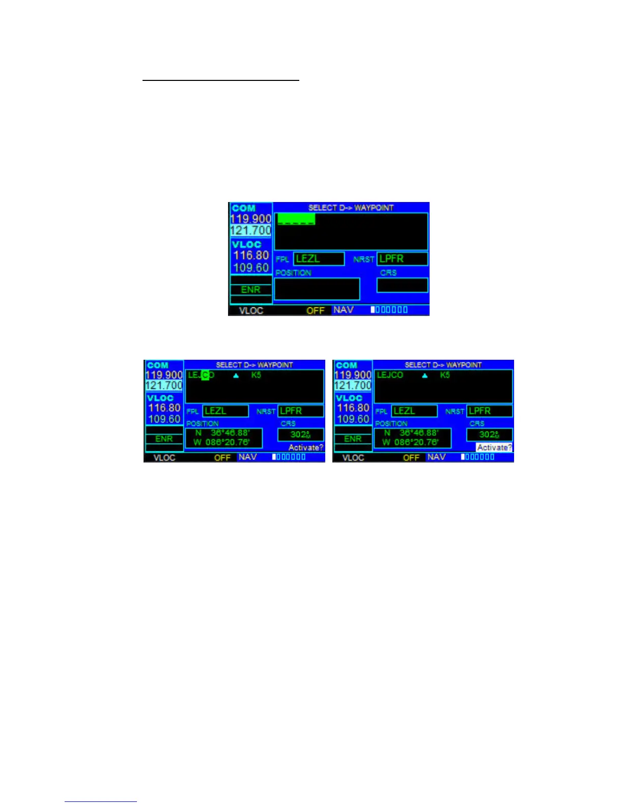 use of the small and large right knobs to enter the destination waypoint’s identifier. A