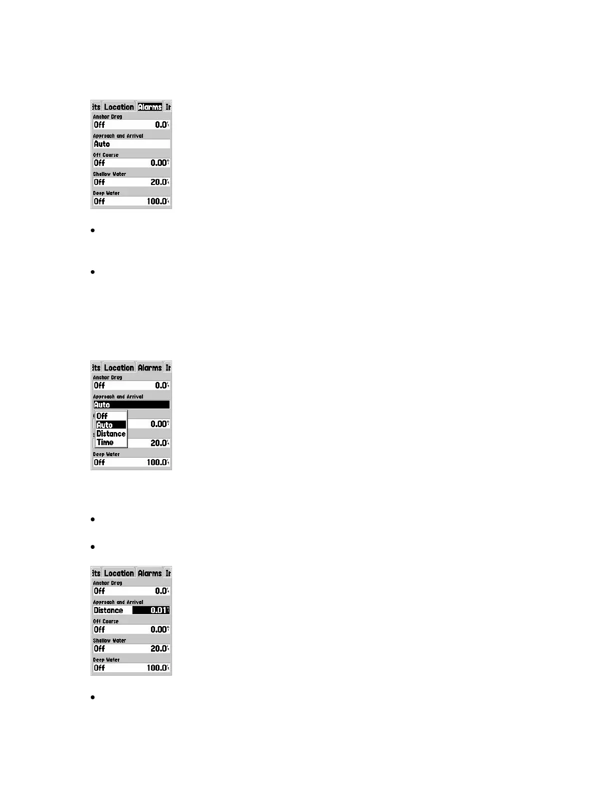 The Alarms tab contains settings for Anchor Drag, Approach and Arrival, Off