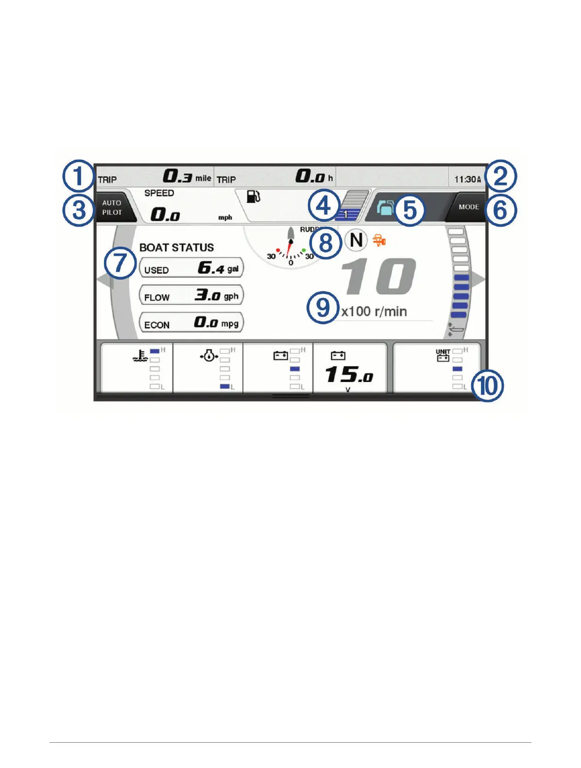 Select Vessel > YAMAHA to view the Yamaha engine gauges. This screen varies based on the engine network