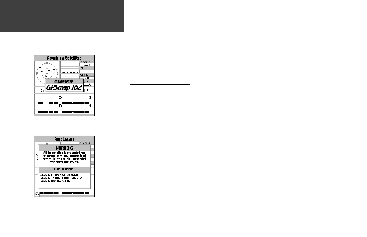 collect satellite data and establish its present position. To ensure proper initialization, the GPSMAP 162