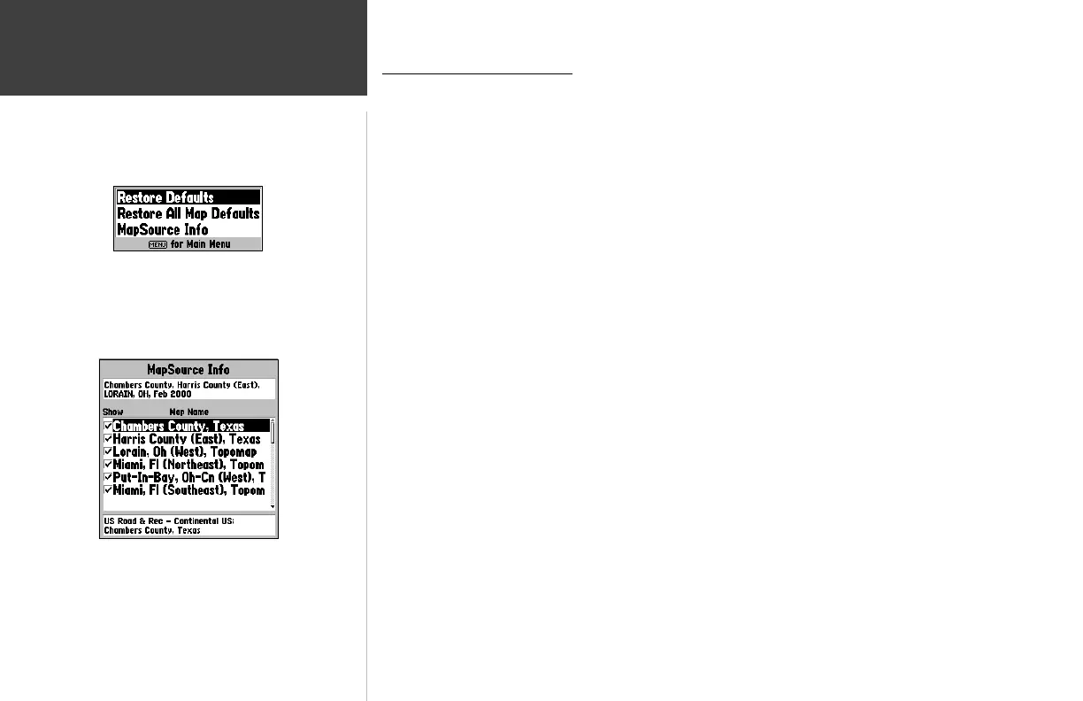 • MapSource Info— allows you to display/not display optional map sets loaded in the unit.
