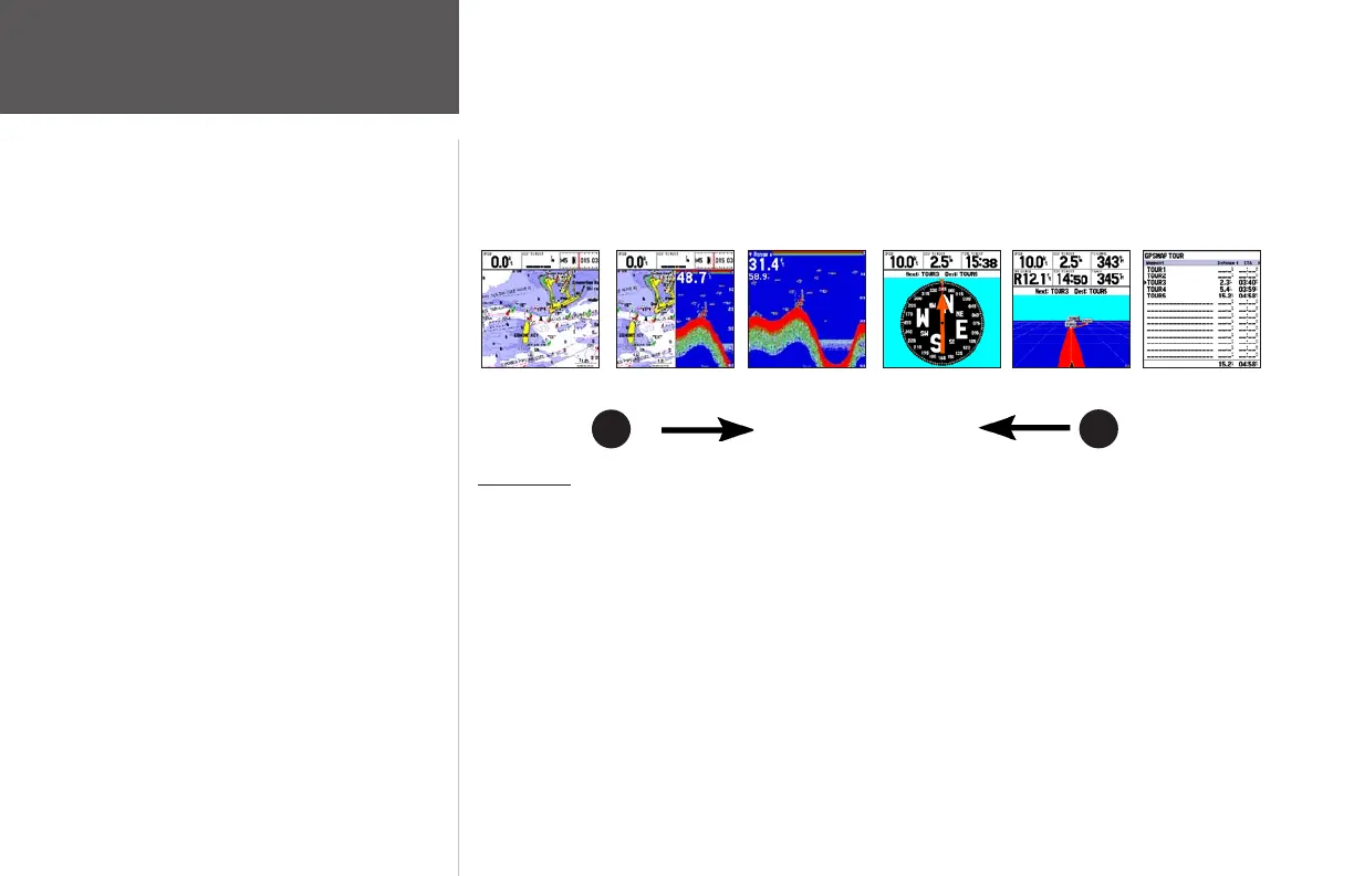 are the Map Page, Map/Sonar Split Page*, Sonar Page* , Compass Page, Highway Page, and Active Route