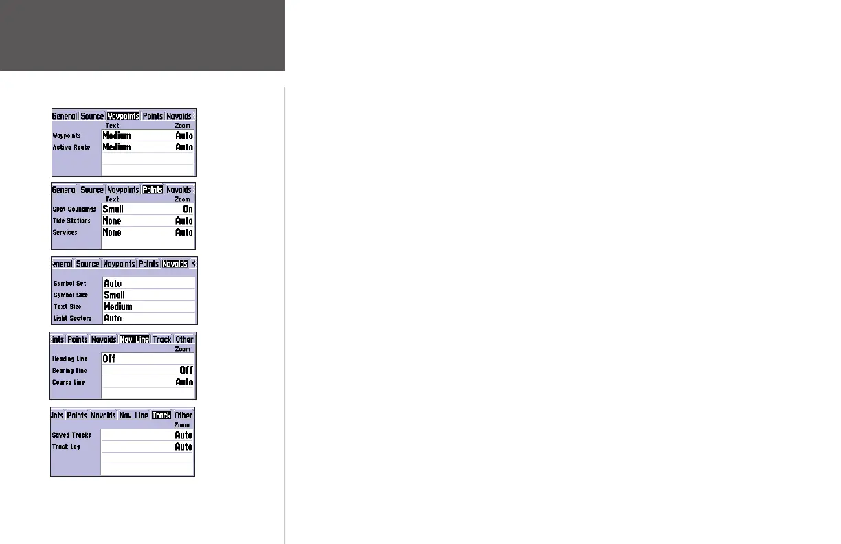 Course Line— Auto, Off, 20 ft.-800 mi.: sets the maximum zoom scale at which the desired course