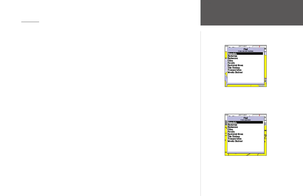BlueChart or MapSource information loaded on a data card. Press the FIND key to search for items