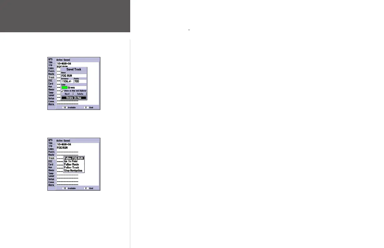 • Review On Map – displays the saved track log on a Track Map page.