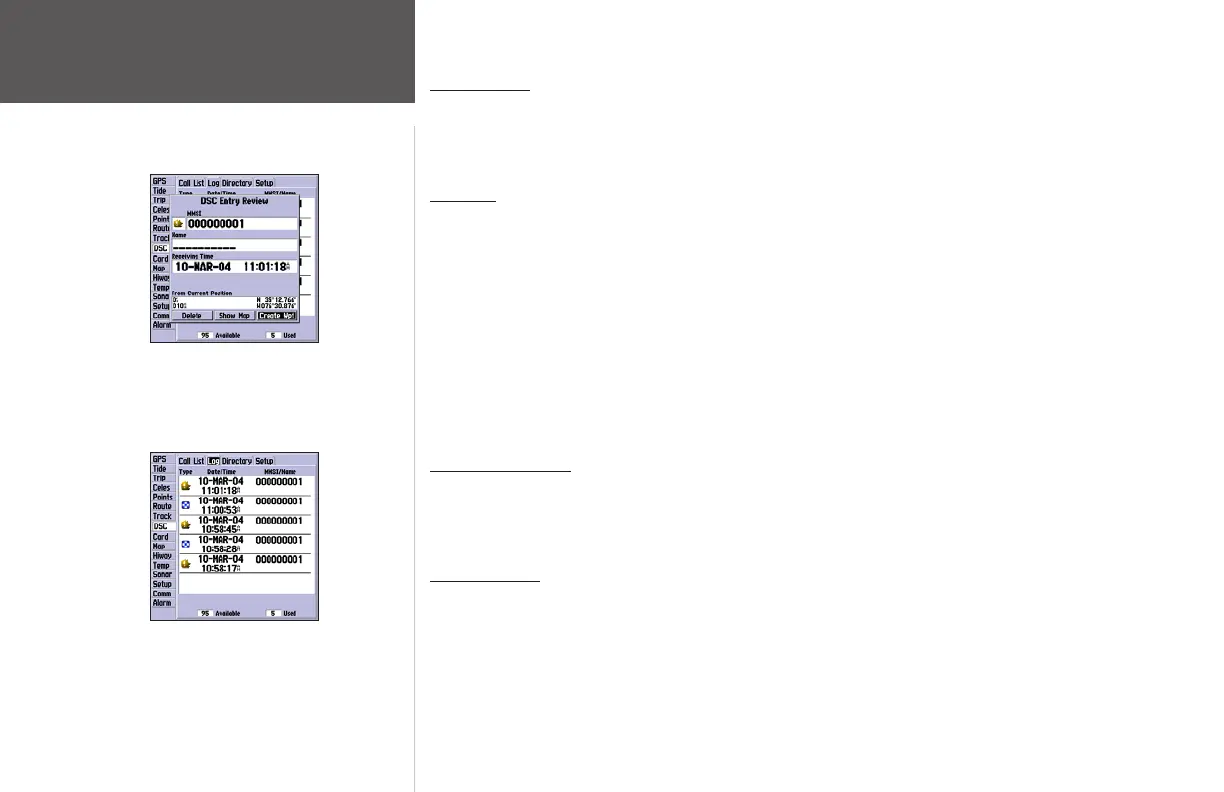The DSC Call List displays the current calls received. The GPS can manage up to 50 calls. When