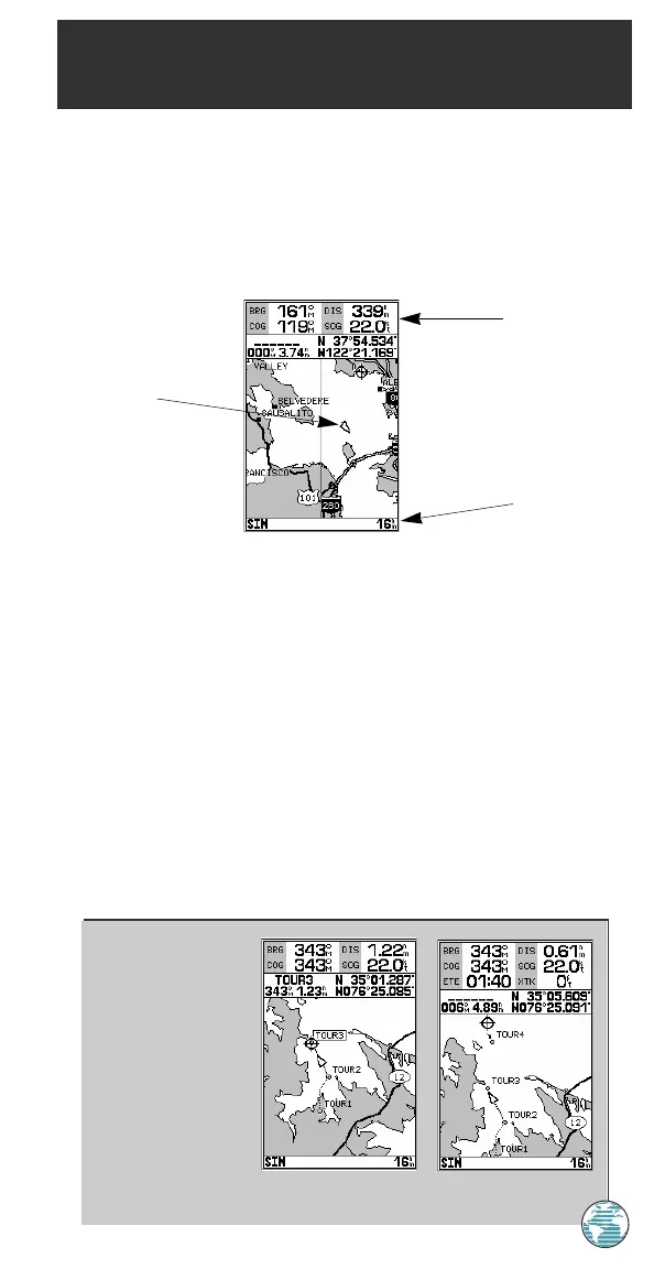 ground, and the bearing and distance to the cursor or a particular waypoint.