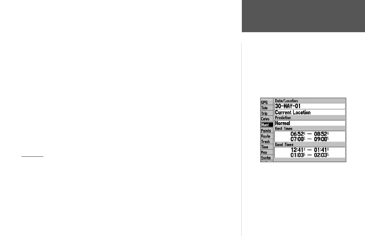 Hunt Tab— displays good and best times and a condition prediction for hunting. You can select a data