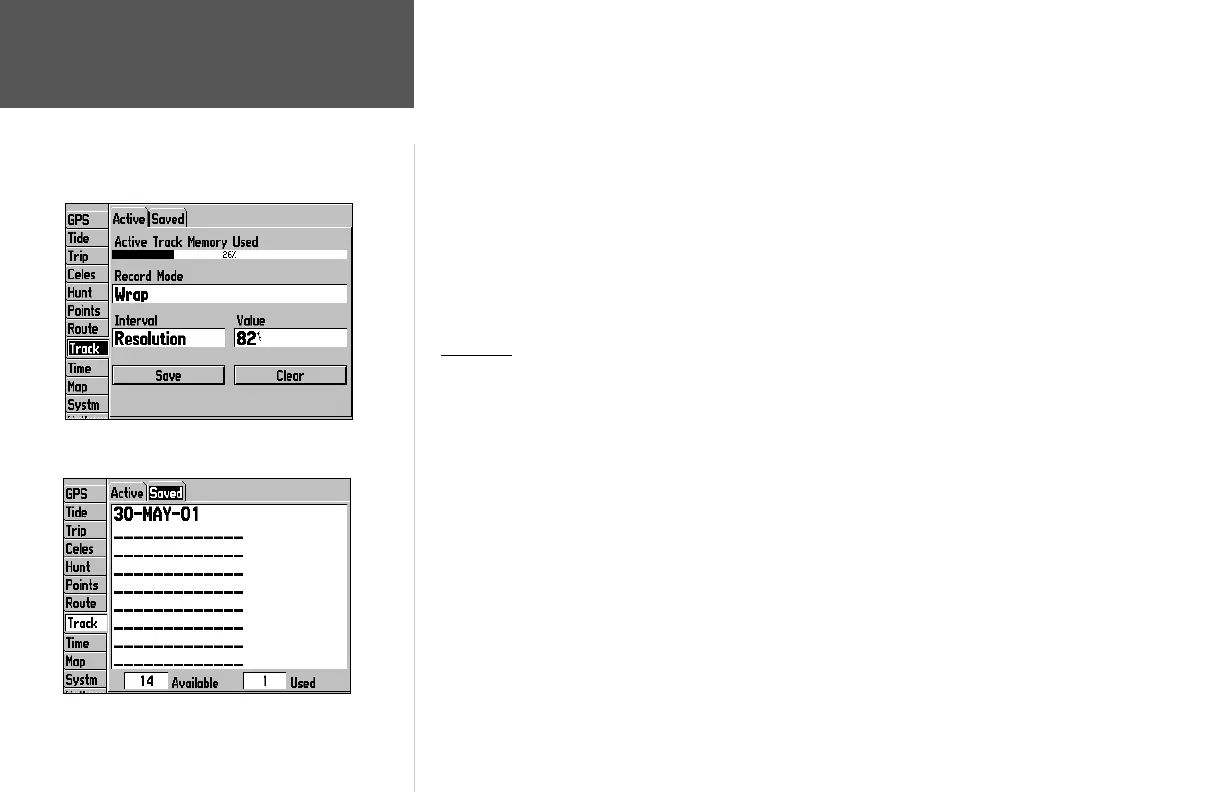 upon the criteria specifi ed in the Track settings. Up to 15 track logs may be saved in memory, with up