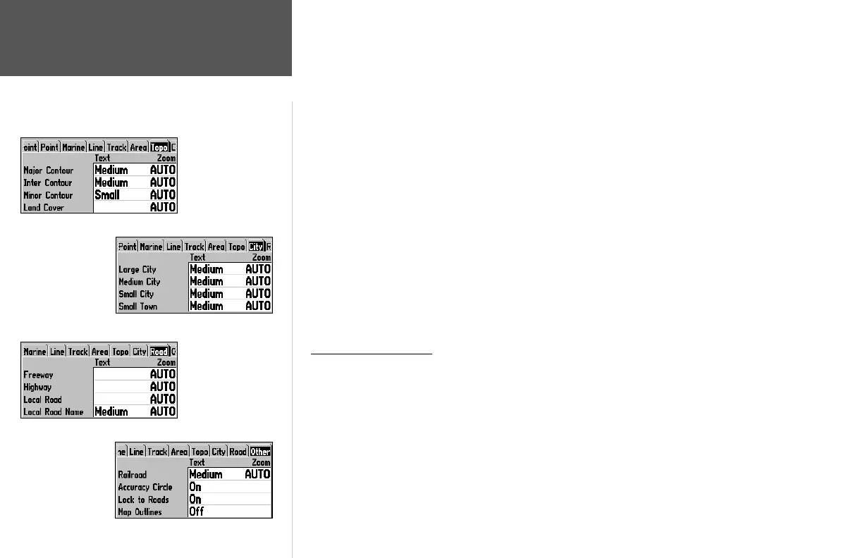 Zoom— Auto, Off, 20 ft.-800 mi.: sets the maximum scale at which the cities appear on the screen.