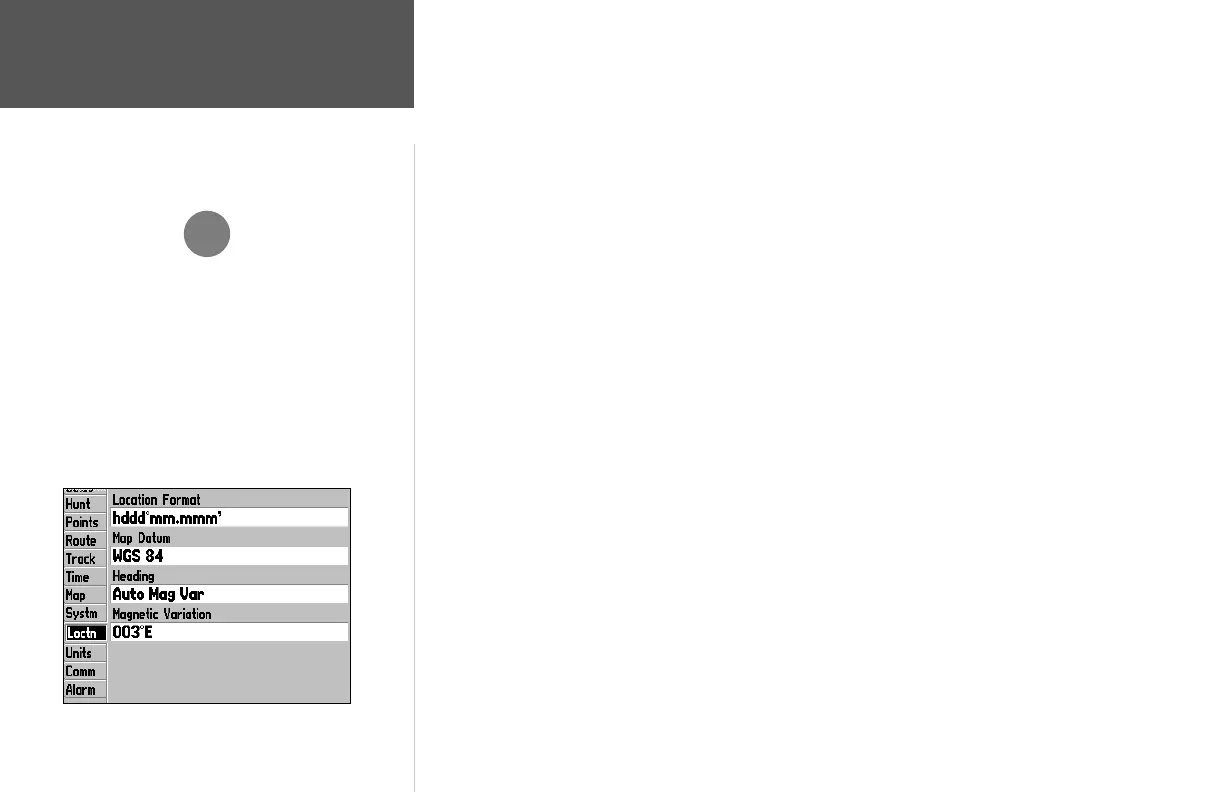 Location (Loctn) Tab— defi nes settings for Location Format, Map Datum, Heading, and Magnetic
