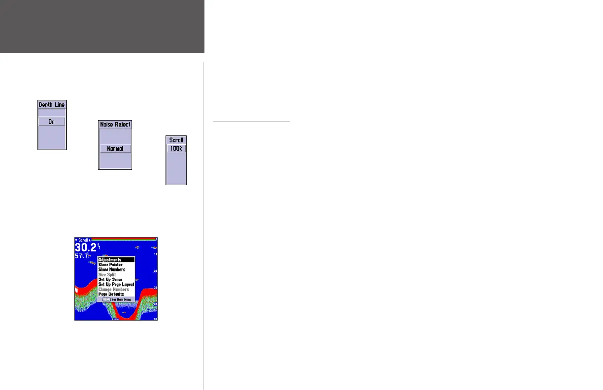 The GPSMAP 178/178C Sounder’s Sonar Page features a menu page that provides access to addi-