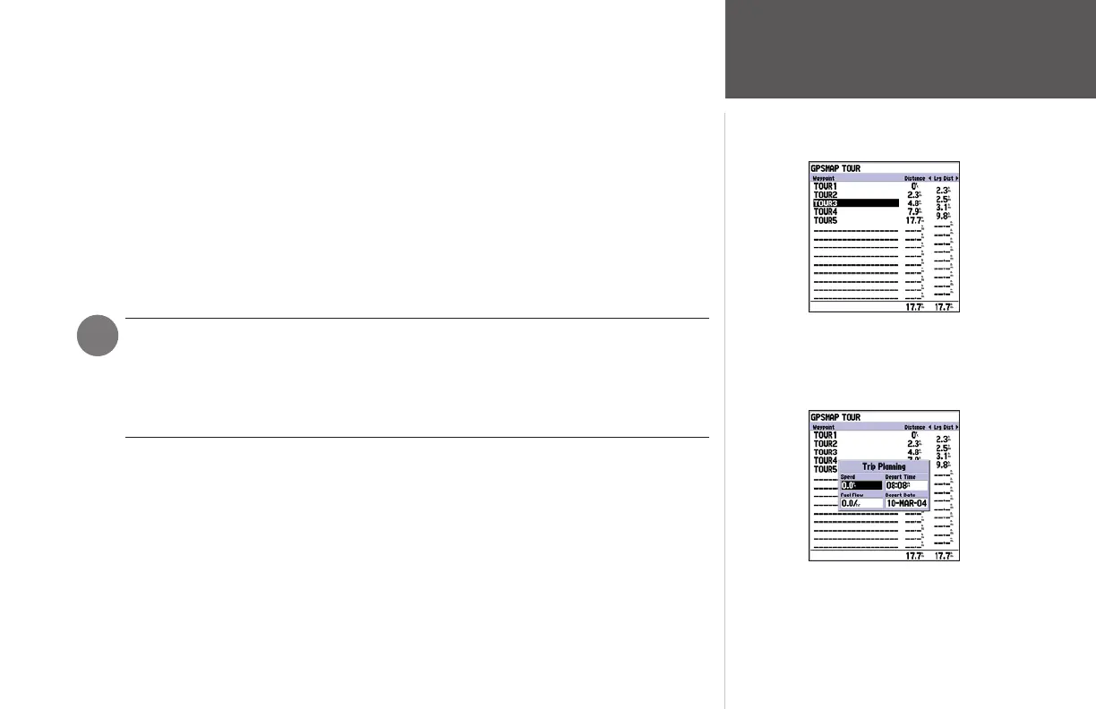 • Trip Planning — The Route Review and Active Route Pages also display trip-planning information for
