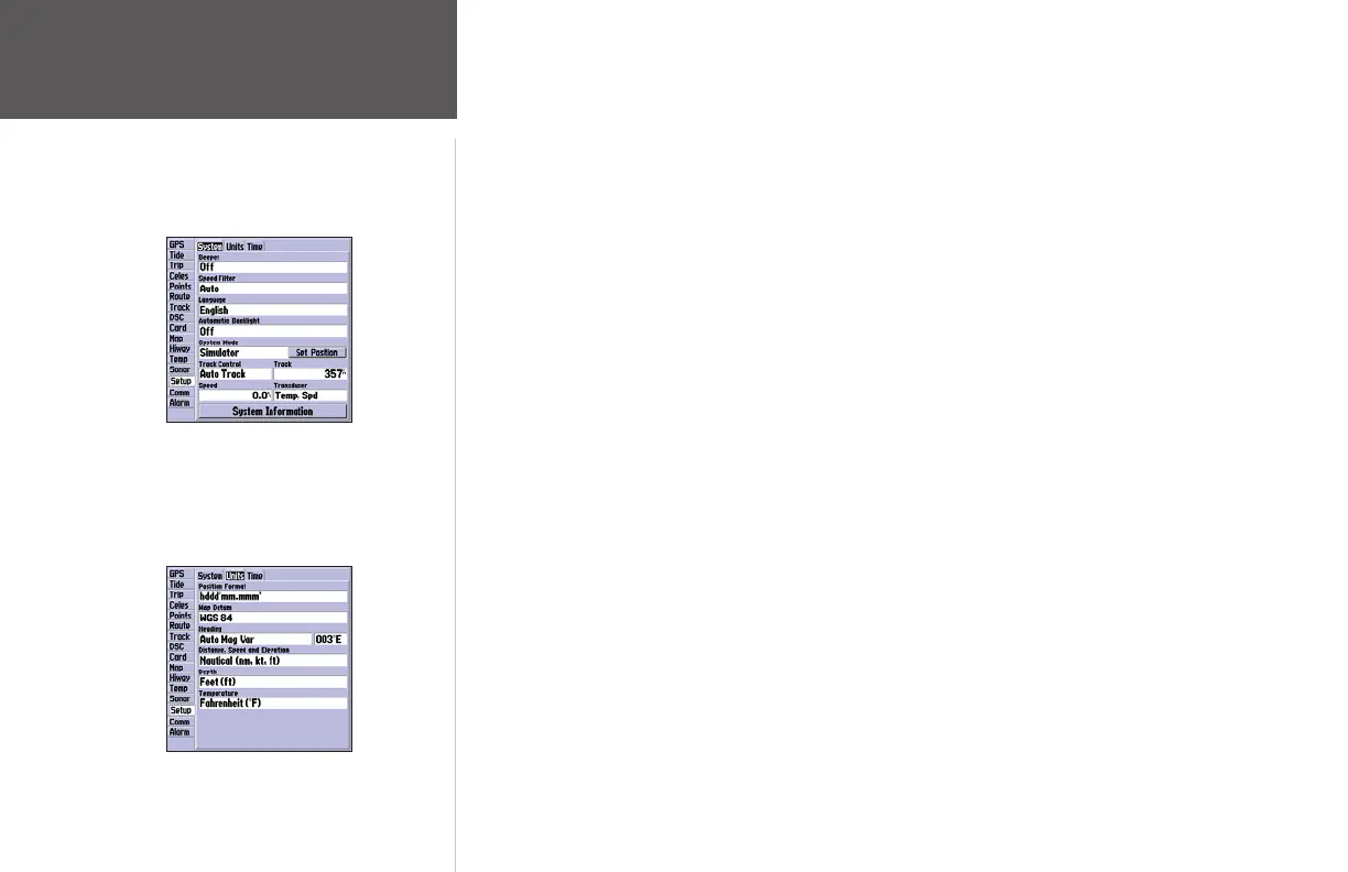 Units SubmenuTab— defines settings for Position Format, Map Datum, Heading, Distance, Speed,