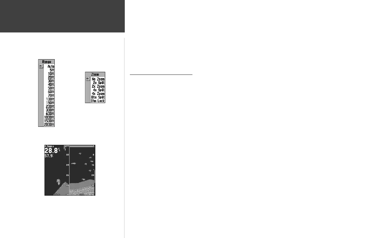 Range— sets the display depth range used for viewing. The unit can be set to automatically track