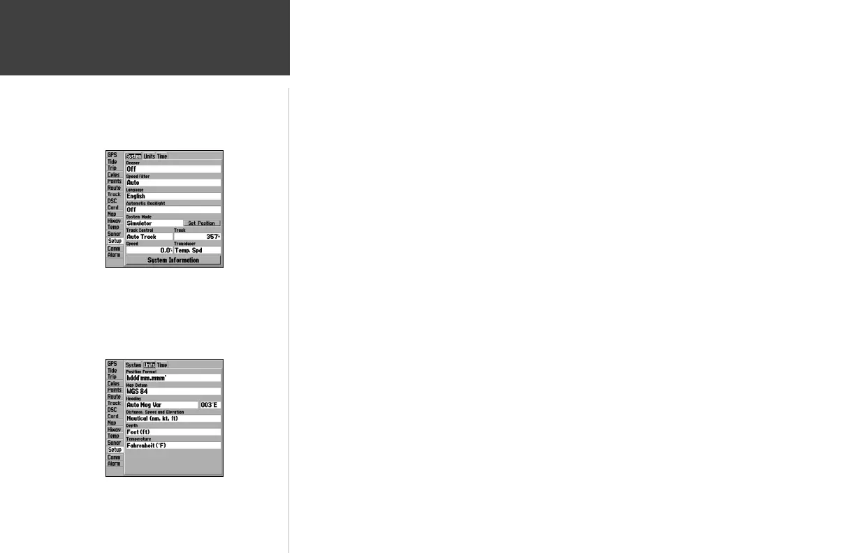 Units SubmenuTab— defi nes settings for Position Format, Map Datum, Heading, Distance,