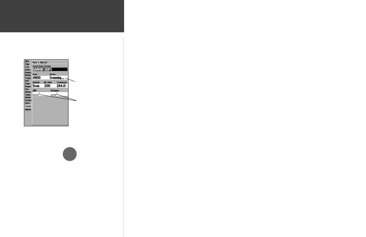 When the unit is receiving a DGPS signal, the “SNR” (Signal to Noise Ratio) and “Distance” fi elds will