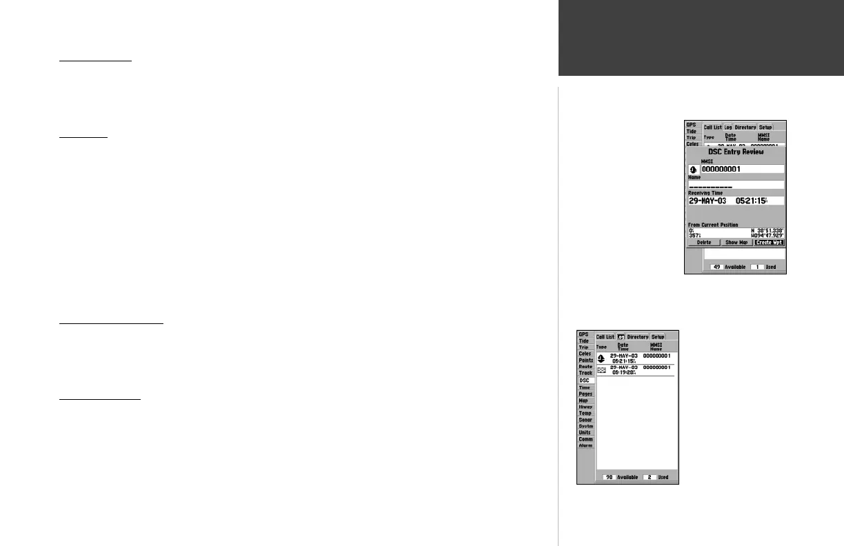 The DSC Call List displays the current calls received. The GPS can manage up to 50 calls. When