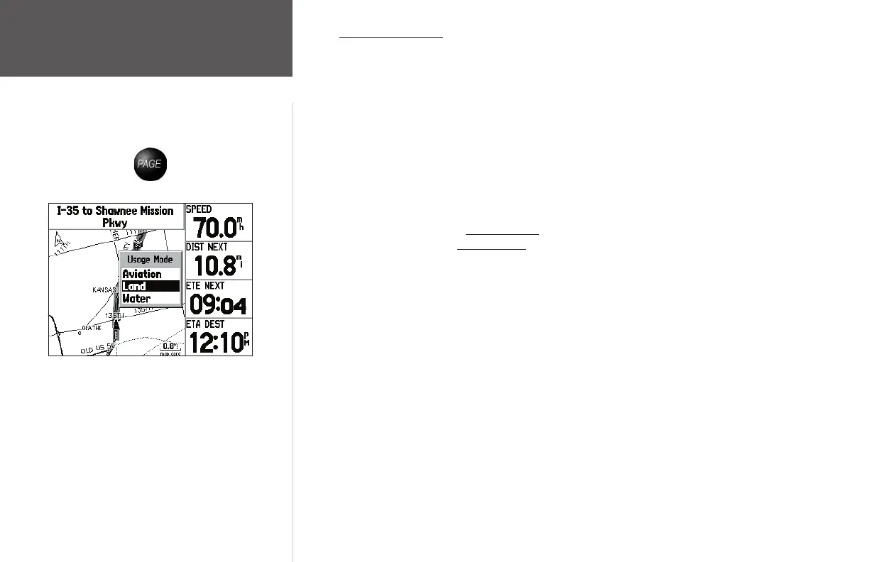 The GPSMAP 196 is designed to be fl exible. The unit provides ‘Aviation’, ‘Land’ and ‘Water’ mode