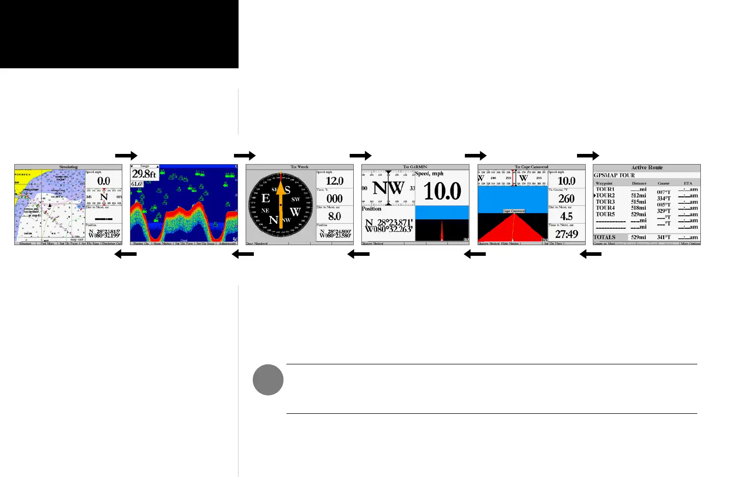 Map Page, Sonar Page, Compass Page, Numbers Page, Highway Page and the Active Route Page. When the