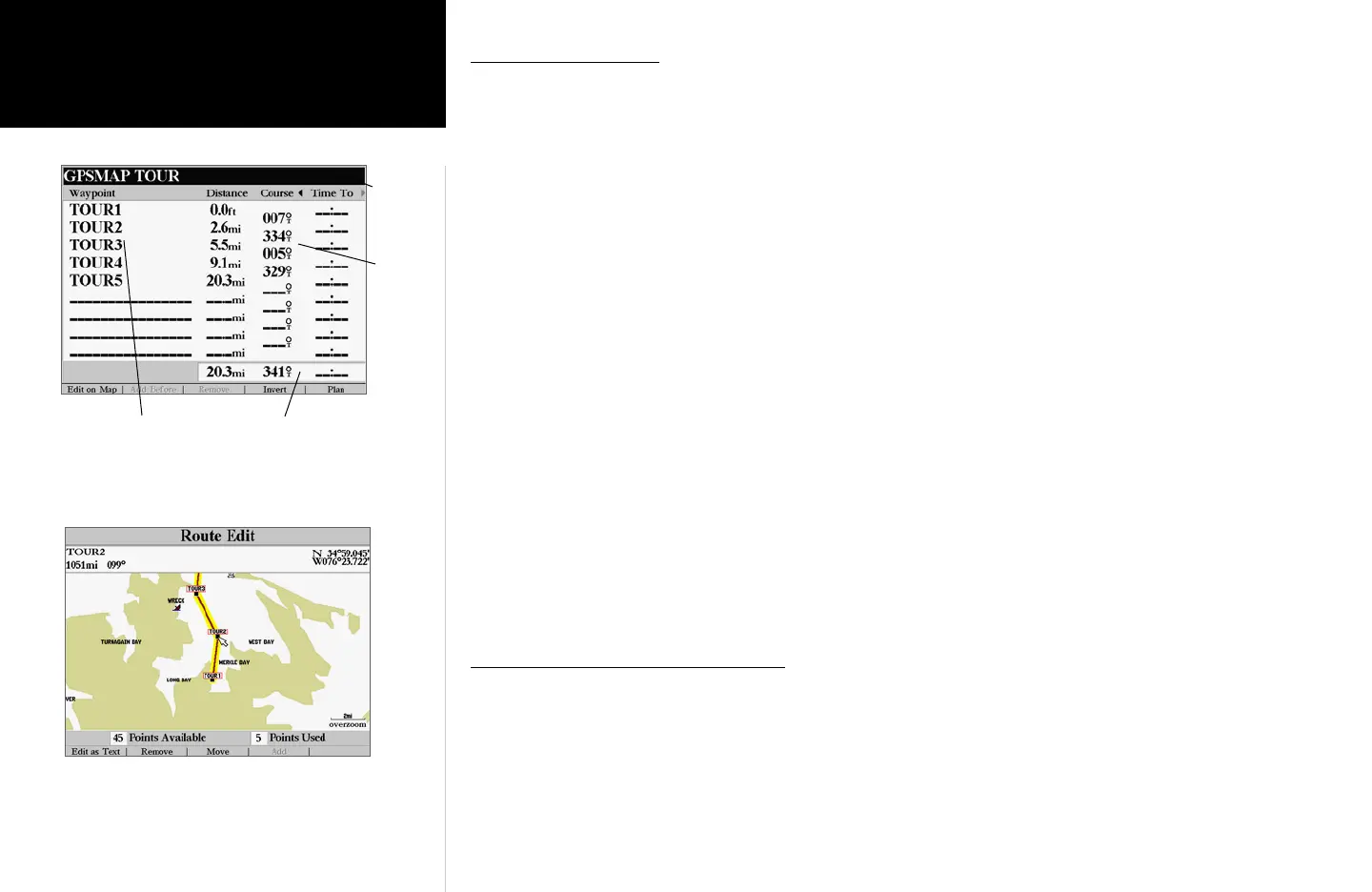 item) on a map page. You may also use the cursor to insert a new route point on a route leg, review the