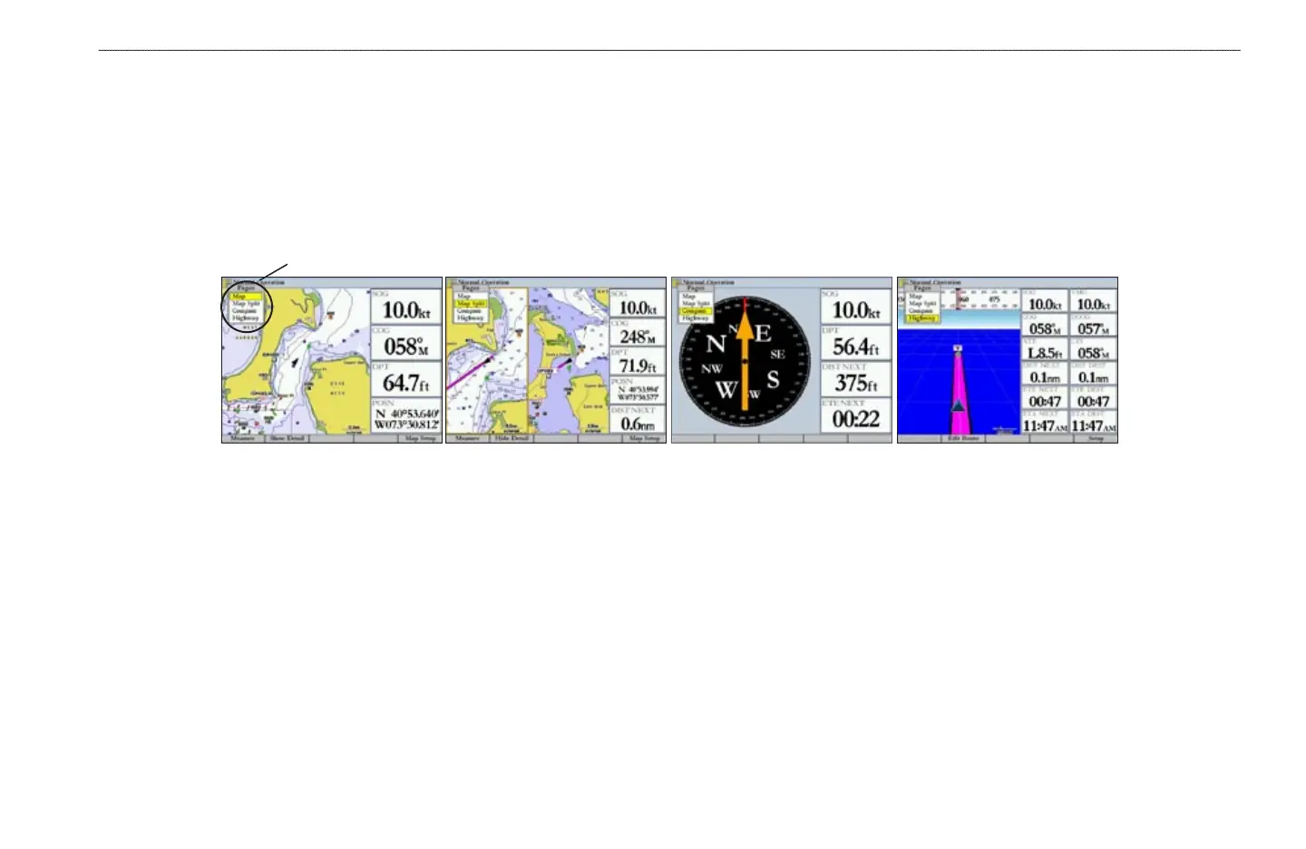 The GPSMAP 3005C has four main pages that are always available: Map Page, Map Split Page, Compass Page, and Highway Page. Press PAGE to cycle through the