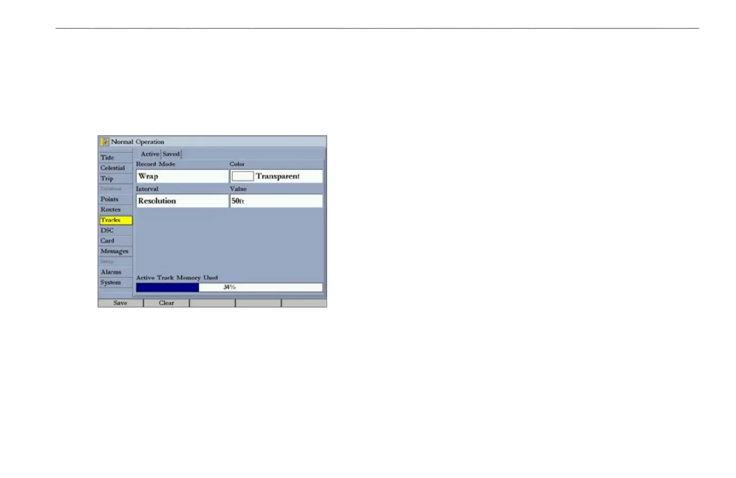 • Clear—clears the active track log currently stored in memory.
