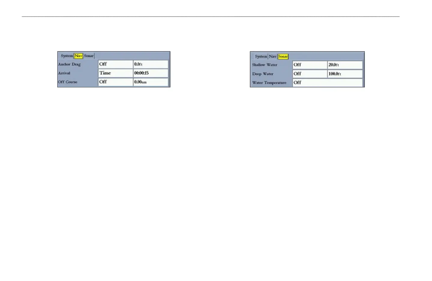 Use the Sonar sub tab to set sonar alarms, including shallow or deep water,
