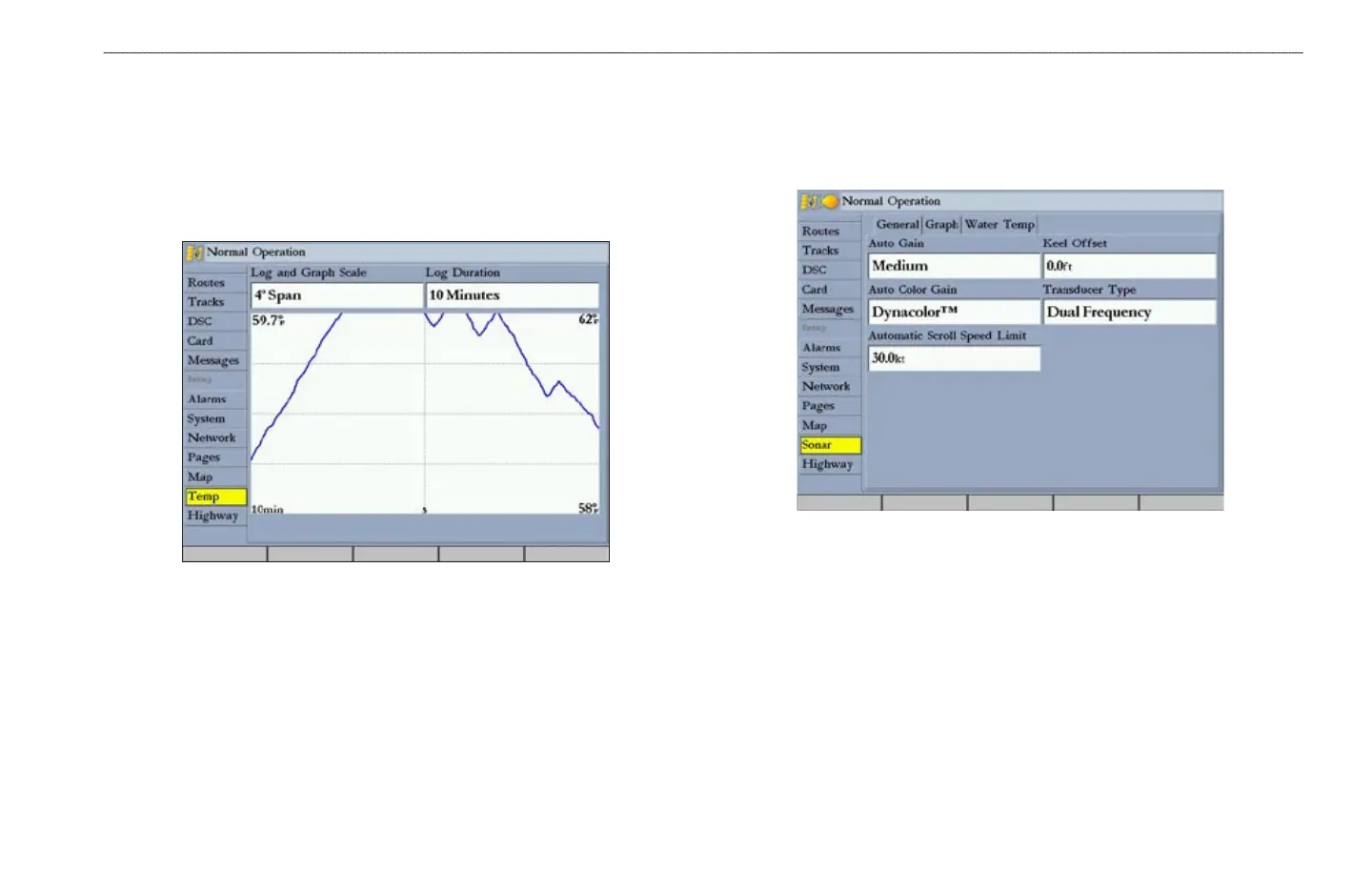MAIN MENU > TEMP (TEMPERATURE) TAB AND SONAR TAB