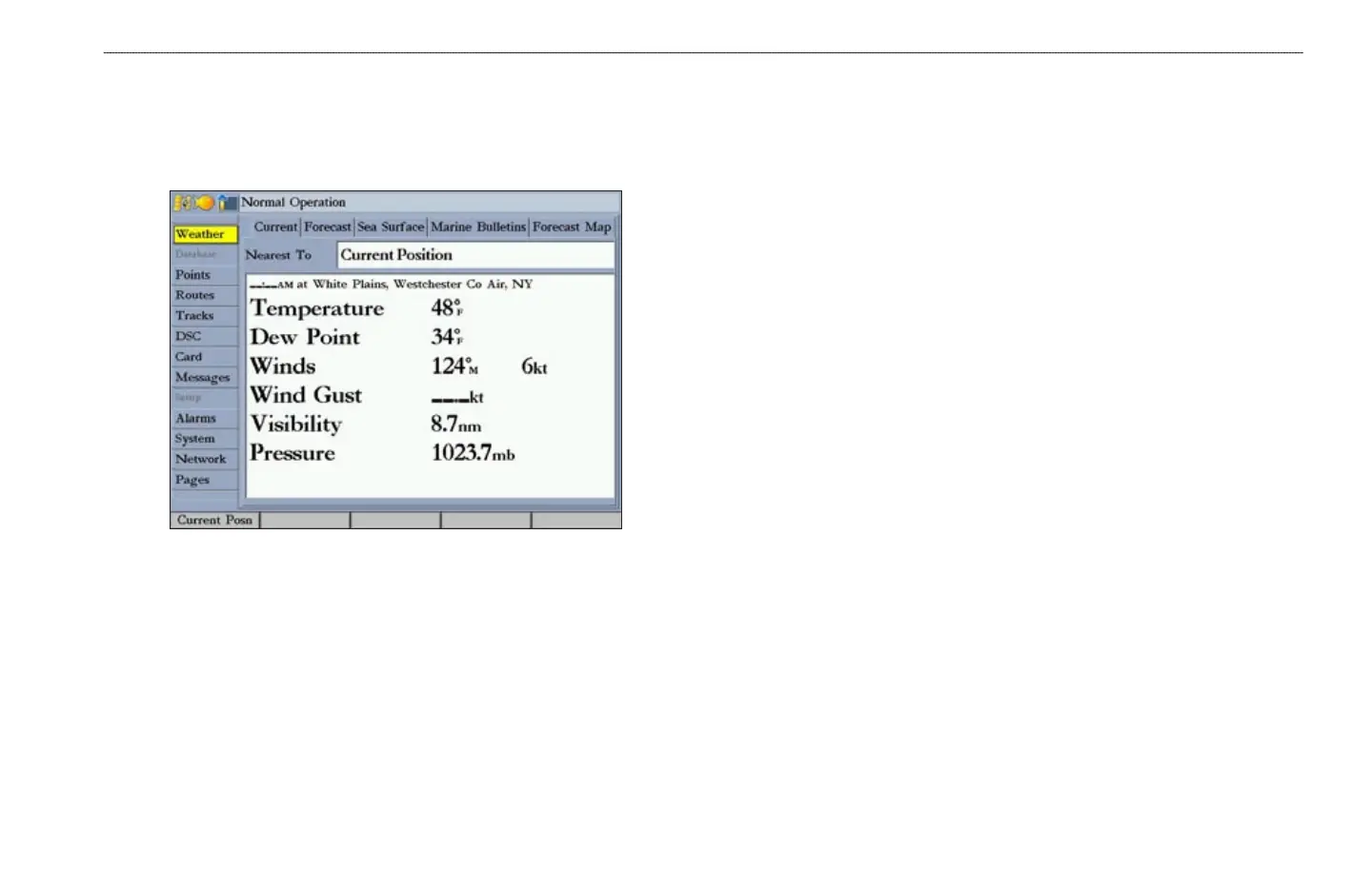 Weather tab has six sub tabs: Current, Forecast, Sea Surface, Marine Bulletins,