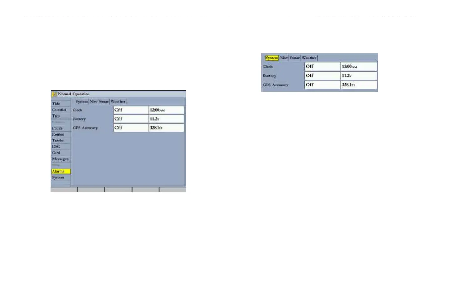 Use the System sub tab to set alarms for the system clock, batteries, and GPS
