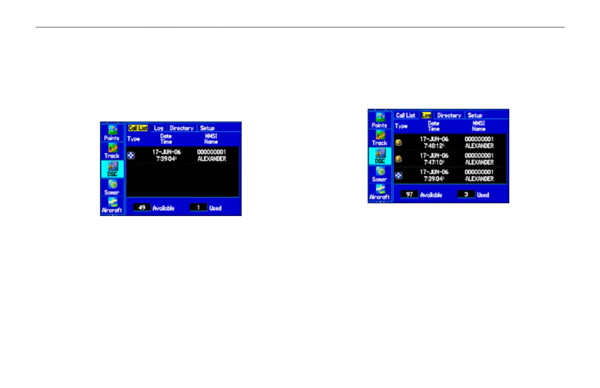 The DSC Call List shows the 50 most recent calls, even if the unit